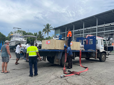 When Crabby's crate arrived in Port Denarau, of course there were hassles. First the crate was a problem. Our 92 lb. new dinghy somehow arrived in a 500 lb. crate. Real head scratcher there. Then, the fork-lift I paid for to unload the dinghy from the flat-bed truck broke. Now I have to rent the BIGGER fork-lift for more money. OK. No options there. Then the customs guy had to watch us open the crate and inspect the dinghy. I guess this is how they keep drugs out of Fiji, but the customs agent was a lot more focused on what we were going to do with the old dinghy. "Throw it out, sir. It's garbage. It barely floats". There are apparently forms required for this so we endured that hassle for a while.